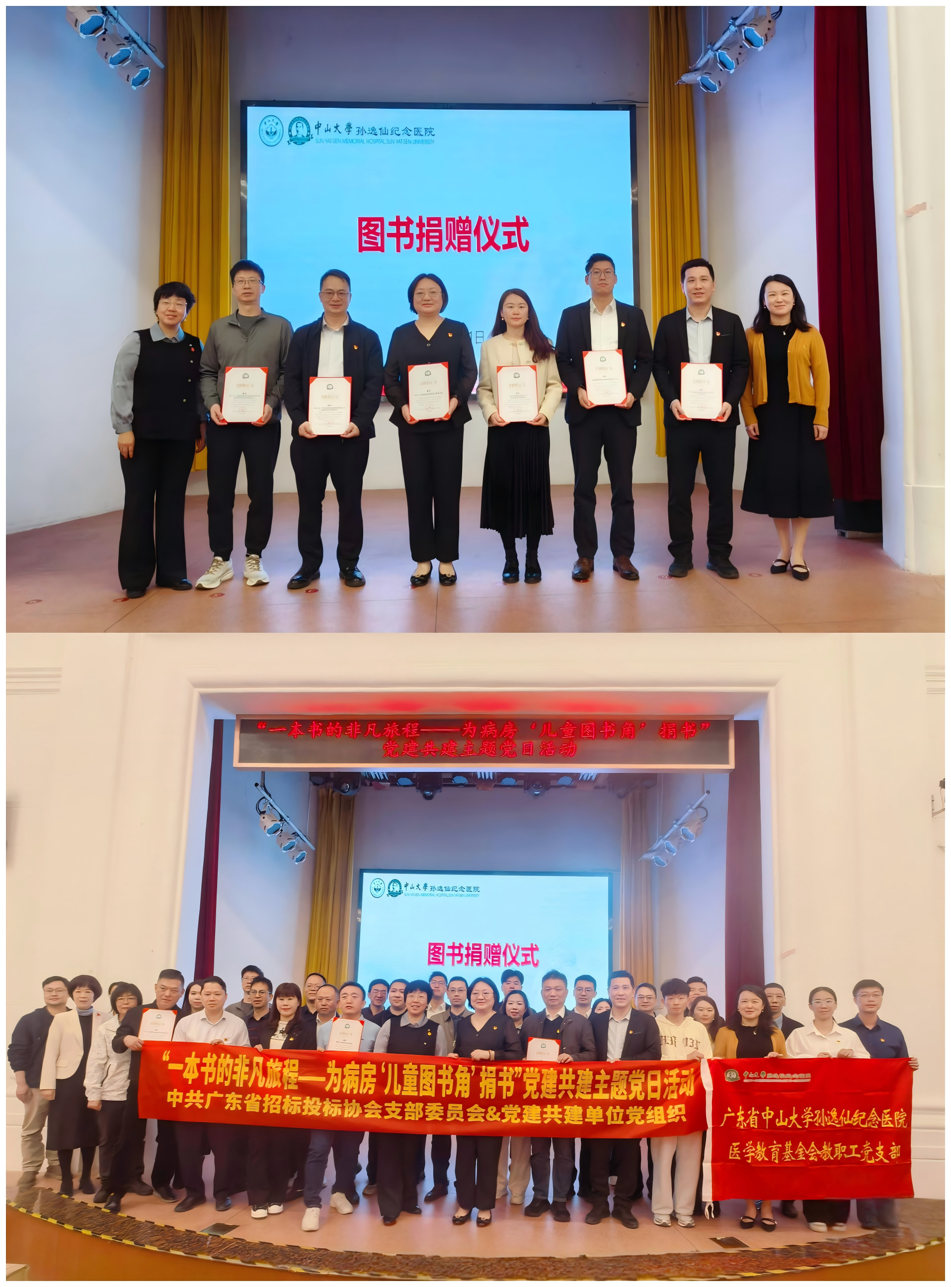 随后,各单位代表依次上台捐赠图书,广东省中山大学孙逸仙纪念医院医学教育基金会向各捐赠单位颁发了捐赠证书,对大家的善举表示诚挚感谢,现场气氛温馨而热烈。活动最后,全体人员合影留念,共同见证这一美好时刻。此次捐赠活动共筹集图书1885册,将为病房内的儿童提供丰富的阅读资源,助力他们在病榻上也能感受到知识的温暖和文化的滋养,进一步营造书香氛围,促进儿童身心健康发展。